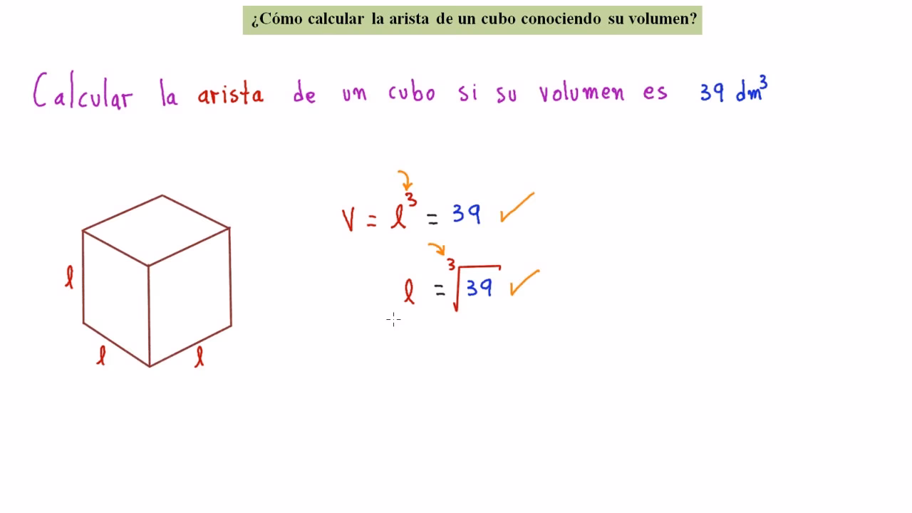 Para encontrar la arista (a) cuando conocemos el volumen (V), debemos despejar a de la ecuación, lo que implica tomar la raíz cúbica de ambos lados: