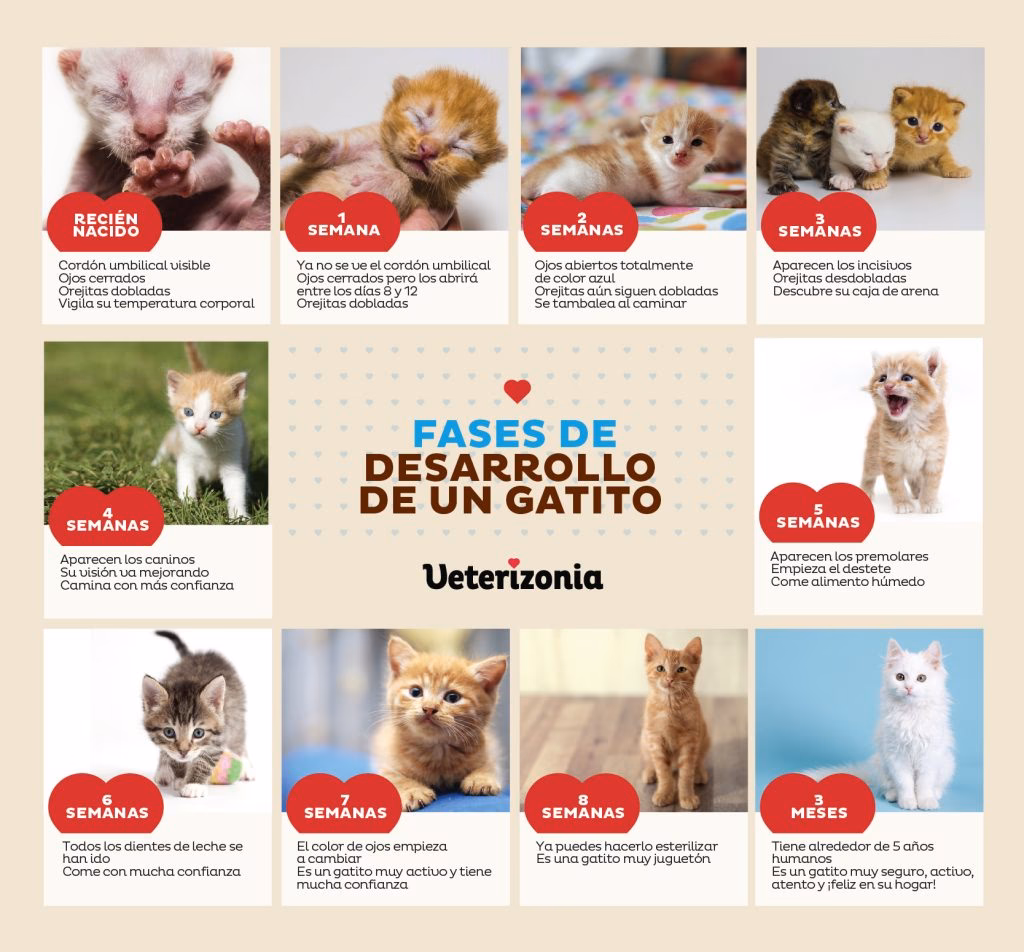 - Infancia (0 a 6 meses gatunos / 0 a 10 años humanos): Los cachorros de gato experimentan un desarrollo muy acelerado. Durante sus primeros meses, pasan de ser pequeños y dependientes a explorar el mundo con curiosidad, desarrollar sus habilidades motoras y sociales. A los 6 meses de edad felina, ya han alcanzado un estado de desarrollo equivalente a un niño humano de 10 años, lo que demuestra la velocidad de su crecimiento físico y mental.