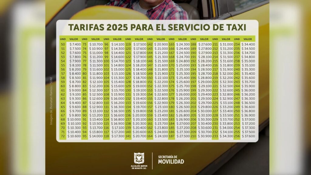 Cada año, la Secretaría de Movilidad de Bogotá actualiza las tarifas de los servicios de transporte público, incluidos los taxis. Los incrementos se basan en estudios técnicos, la variación del Salario Mínimo Mensual Legal Vigente y el Índice de Precios al Consumidor (IPC). Para el año 2025, estas nuevas tarifas entraron en vigencia a partir del 1 de febrero, aplicando en toda la ciudad.