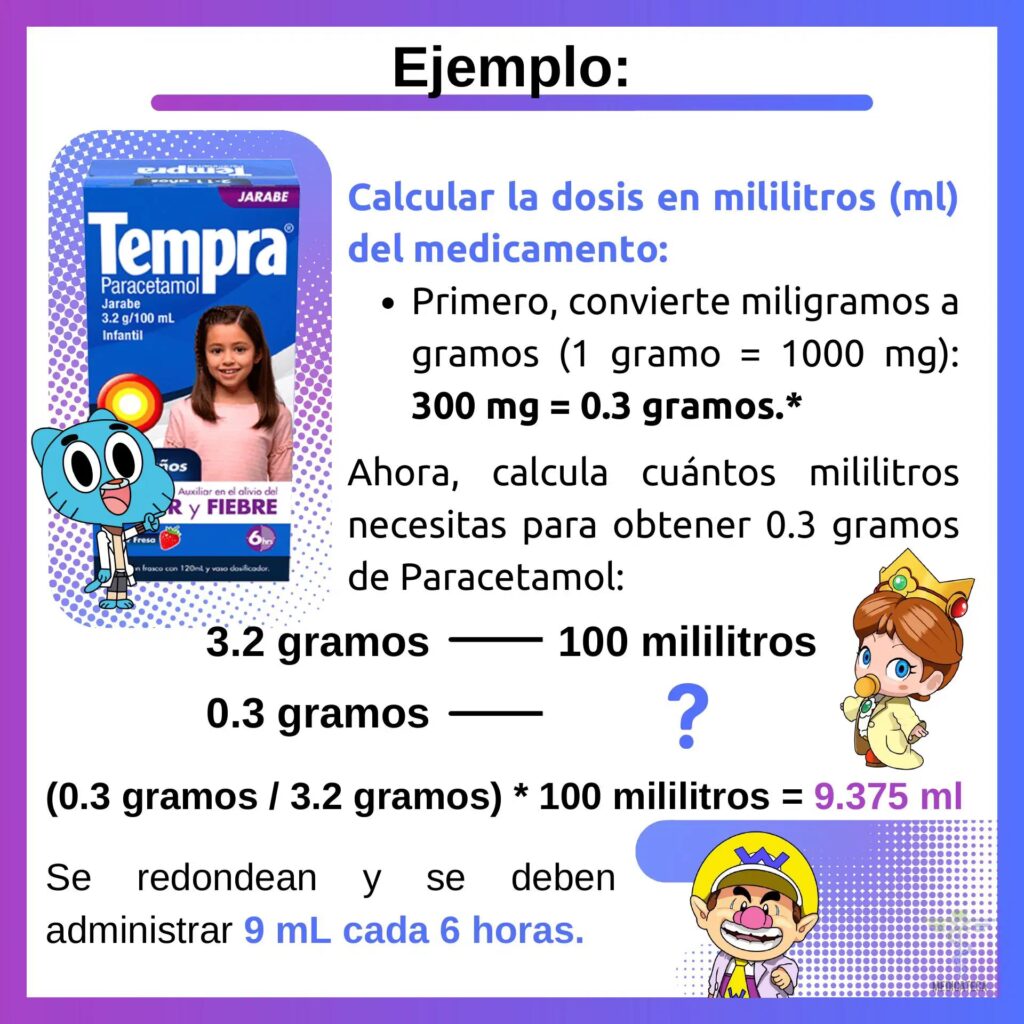 Ahora, si la dosis recomendada para el niño se expresa en miligramos (mg), podemos convertirla fácilmente a mililitros (ml) utilizando la siguiente fórmula: