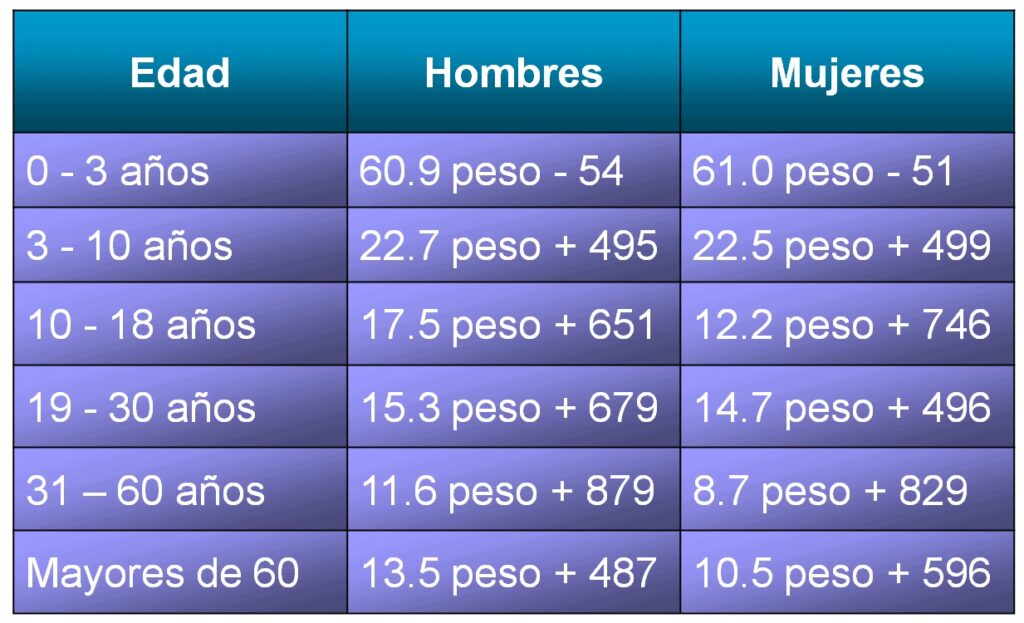 | Fórmula Sencilla | Una aproximación muy básica basada solo en el peso corporal y el sexo. | Extremadamente simple y rápida para una estimación muy rudimentaria. | Muy poco precisa, no considera edad, altura, composición corporal ni otros factores importantes. Solo para una idea muy general. |