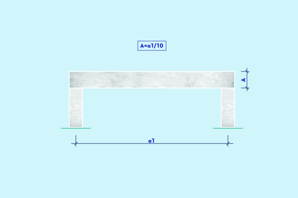 - Vigas con dos apoyos y sin voladizos en sus extremos: Para estas vigas simples, la altura (A) se calcula dividiendo la luz (a1) por 10. El resultado obtenido debe redondearse al múltiplo de 5 superior más cercano. Por ejemplo, si el cálculo da 32 cm, se redondearía a 35 cm.