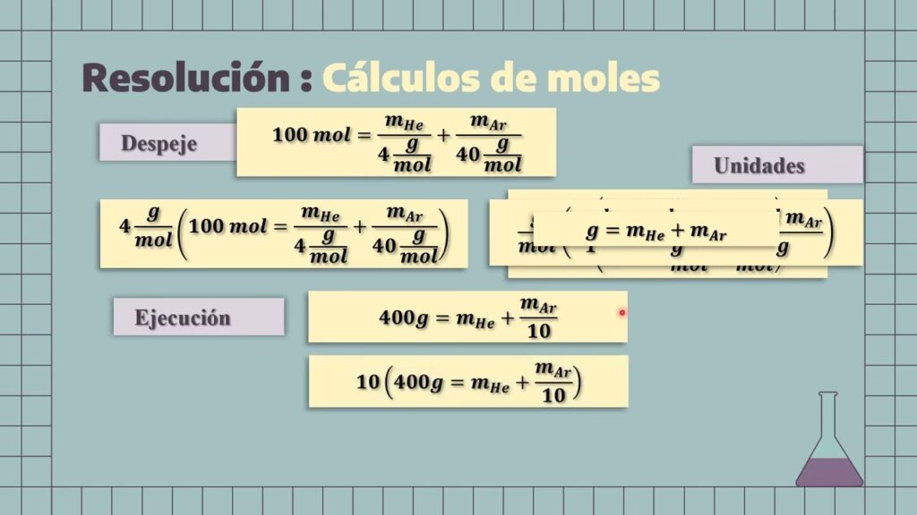 - Consistencia de Unidades: Asegúrate de usar las mismas unidades para todas las cantidades de un tipo (por ejemplo, todos los volúmenes en ml, todas las masas en gramos).