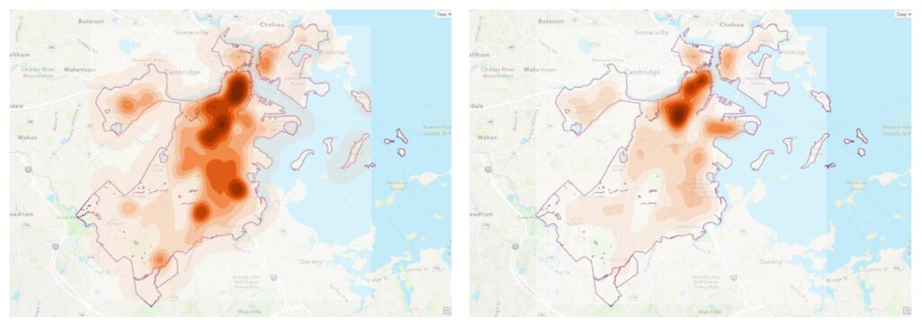 - Conversión de Ráster a Vector (ArcGIS Online): Mientras que la herramienta Densidad Kernel en ArcGIS Pro produce una salida ráster (una cuadrícula de celdas con valores de densidad), las herramientas de análisis de ArcGIS Online, como Calcular Densidad, están diseñadas para crear salidas vectoriales. Por lo tanto, después de que el cálculo de densidad inicial se realiza como un ráster, se utilizan herramientas de geoprocesamiento como 'Reclasificar' y 'De ráster a polígono' para convertir el ráster a polígonos. Estos polígonos son luego clasificados y estilizados para mostrar los niveles de densidad en el Visor de Mapas.