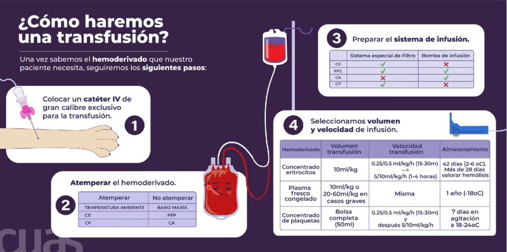 Una vez que la sangre ha sido tipificada, se ha realizado la prueba cruzada y se ha seleccionado la unidad de sangre, comienza la transfusión. La unidad se retira del refrigerador y se calienta lentamente a temperatura ambiente (nunca en microondas). Se utiliza un catéter intravenoso de calibre adecuado (idealmente >22 gauge) para evitar dañar los glóbulos rojos. Siempre se debe utilizar un set de administración de sangre con filtro para eliminar posibles coágulos.