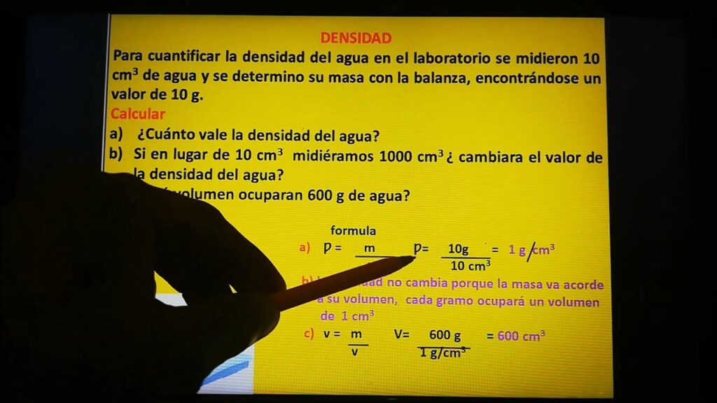 Una vez que tenemos la masa (peso en el aire) y el volumen (calculado a partir del peso del agua desplazada), la densidad se calcula simplemente dividiendo la masa por el volumen: