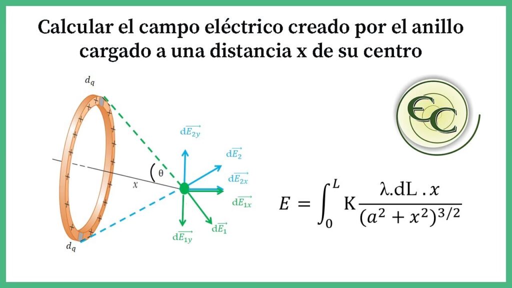 Sustituyendo dE y cosθ (que es x/r = x/√(R² + x²)), y realizando la integración sobre toda la carga Q del anillo, se obtiene la fórmula para la intensidad del campo eléctrico en un punto P sobre el eje de un anillo uniformemente cargado: