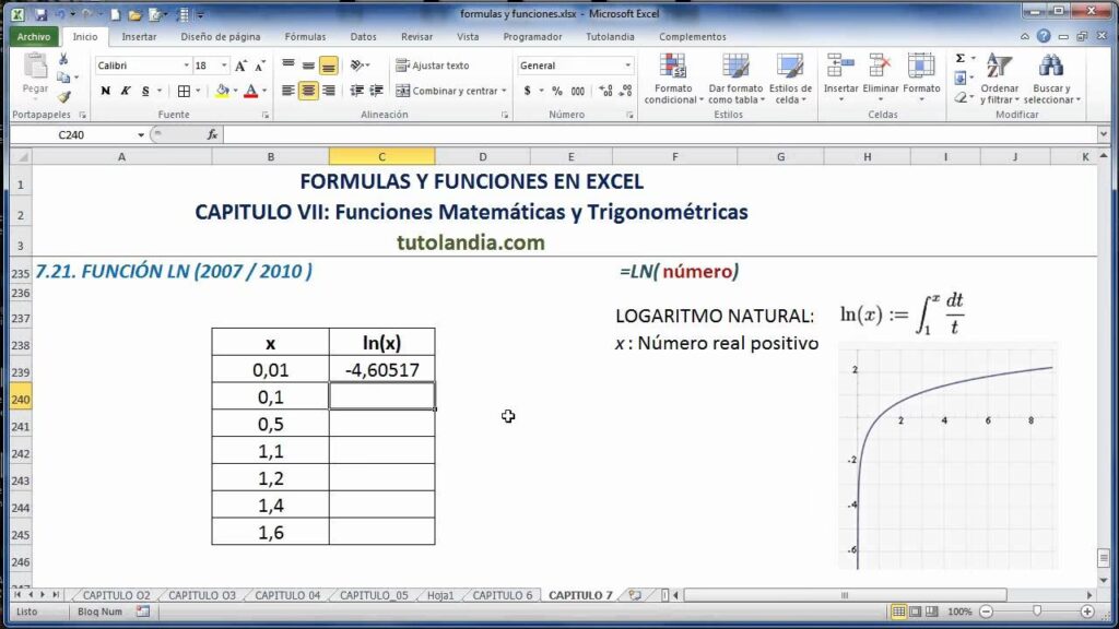 Donde 'número' es el valor positivo del cual deseas calcular el logaritmo natural. Es crucial recordar que, en el sistema de números reales, el logaritmo natural solo está definido para números estrictamente positivos. Intentar calcular el LN de cero o un número negativo resultará en un error.