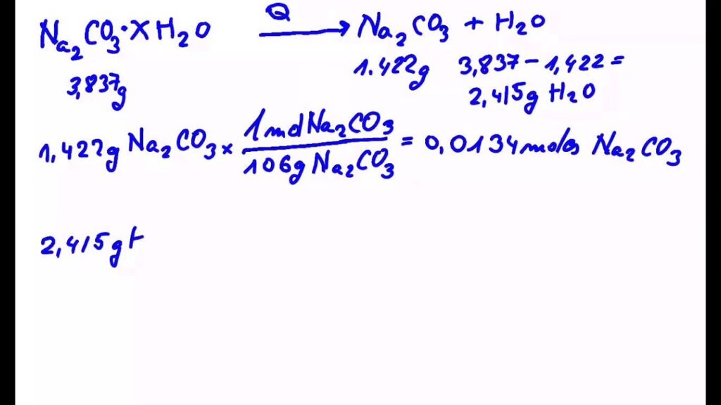 Utilizando la masa molar del agua (aproximadamente 18.015 g/mol), convertimos la masa de agua perdida a moles.Moles de H₂O = Masa de agua (g) / Masa molar de H₂O (g/mol)Paso 3: Convertir la masa de la sal anhidra a moles de sal anhidra.