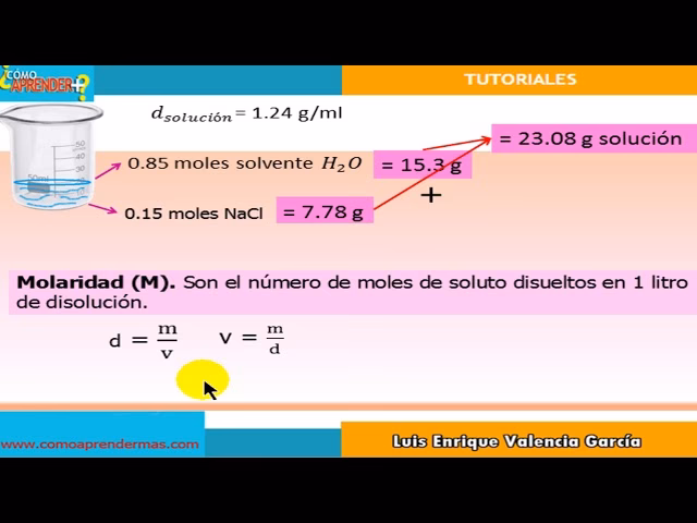 Molaridad (M) = Moles de soluto / Volumen de solución (en litros)