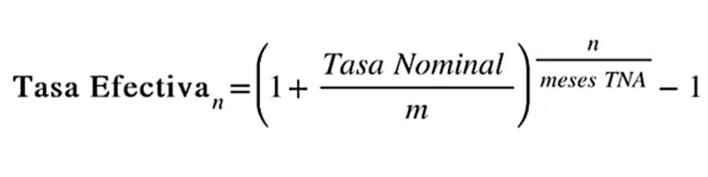TEA_deseadaes la tasa efectiva que queremos calcular.TEA_conocidaes la tasa efectiva que ya tenemos.mes la duración del período de la tasa deseada (en unidades de tiempo).nes la duración del período de la tasa conocida (en la misma unidad de tiempo quem).