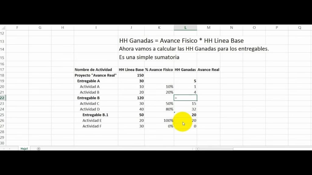 Antes de poder aplicar la fórmula principal, necesitamos calcular las Horas Hombre Ganadas para cada actividad o paquete de trabajo. La forma de obtenerlas es multiplicando el avance físico de la actividad por sus Horas Hombre de Línea Base: