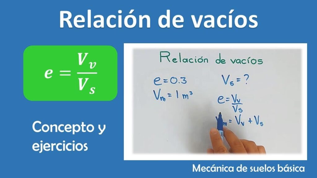 e= Índice de vacíos (es una cantidad adimensional, generalmente expresada como un decimal).Vv= Volumen de los vacíos (o huecos).Vs= Volumen de las partículas sólidas.