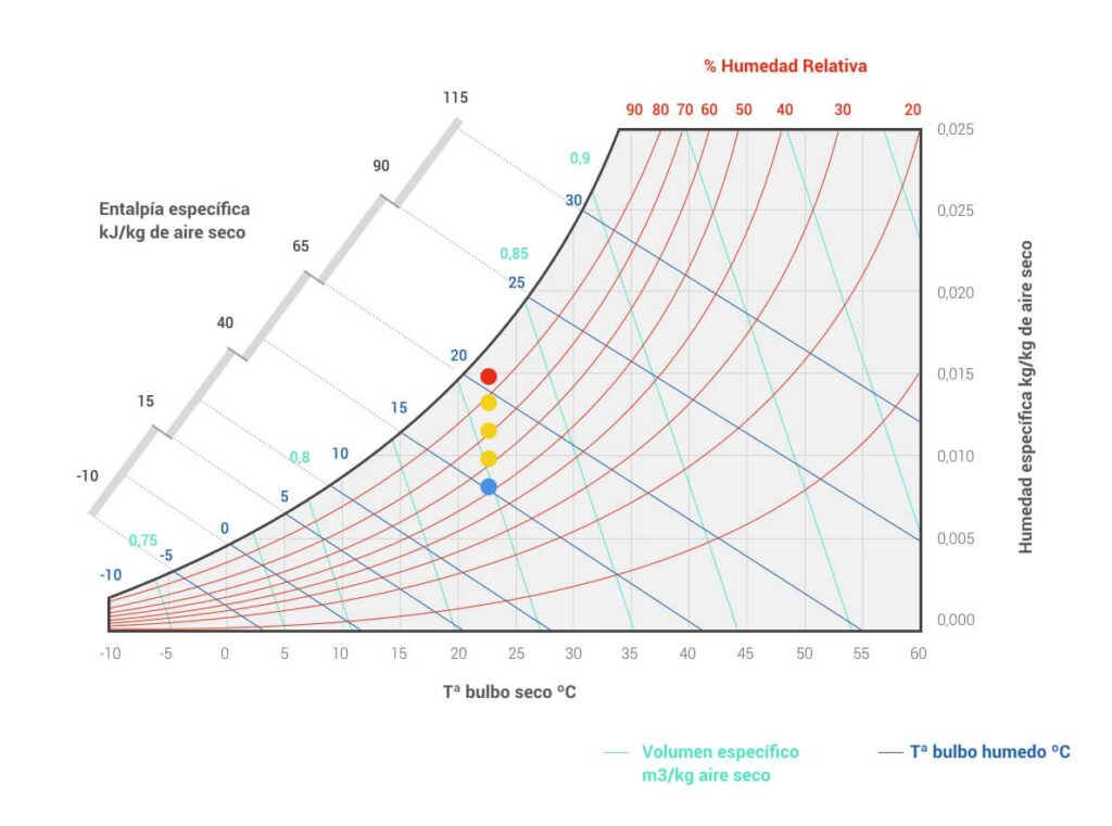 Este es el método más común y práctico, ya que en la mayoría de las aplicaciones se conocen la temperatura de bulbo seco y la humedad relativa o la temperatura de bulbo húmedo.