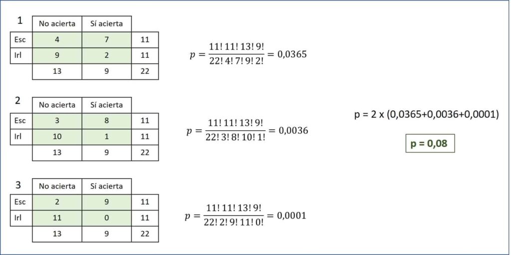 La probabilidad de cada tabla de 2x2 se calcula utilizando la siguiente fórmula basada en la distribución hipergeométrica: