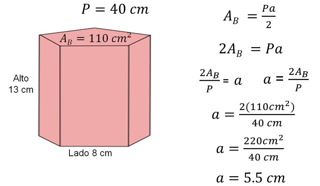 - Ap = (2 × 110 cm²) / 40 cm = 220 cm² / 40 cm = 5.5 cm. La apotema mide 5.5 cm.