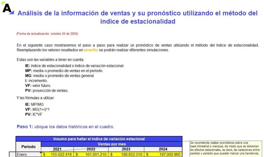 El proceso es sencillo: primero, establece una previsión de ventas total para el próximo año. Luego, multiplica esta previsión anual por el coeficiente estacional de cada periodo para obtener la previsión desglosada.