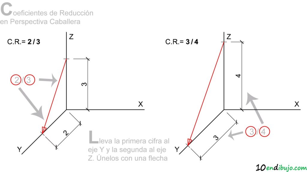 - ¿Cuál es el coeficiente de reducción más común en perspectiva caballera?