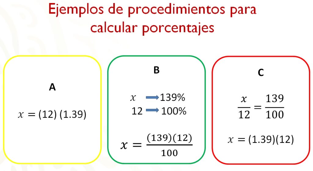 Porcentaje / 100 = Parte / Número - Resolver para la incógnita: Multiplica en cruz y despeja la incógnita.
