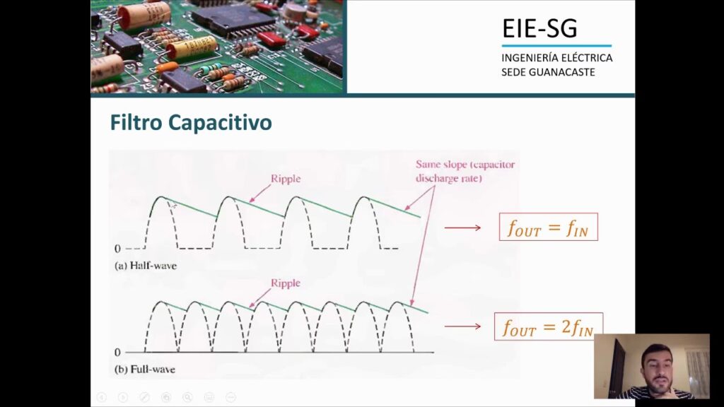 • Voltaje de rizado pico a pico (Vr)pp: Es la diferencia entre el valor máximo y mínimo de la tensión de rizado. Para un rectificador de onda completa con filtro de condensador, se puede aproximar por la siguiente relación: