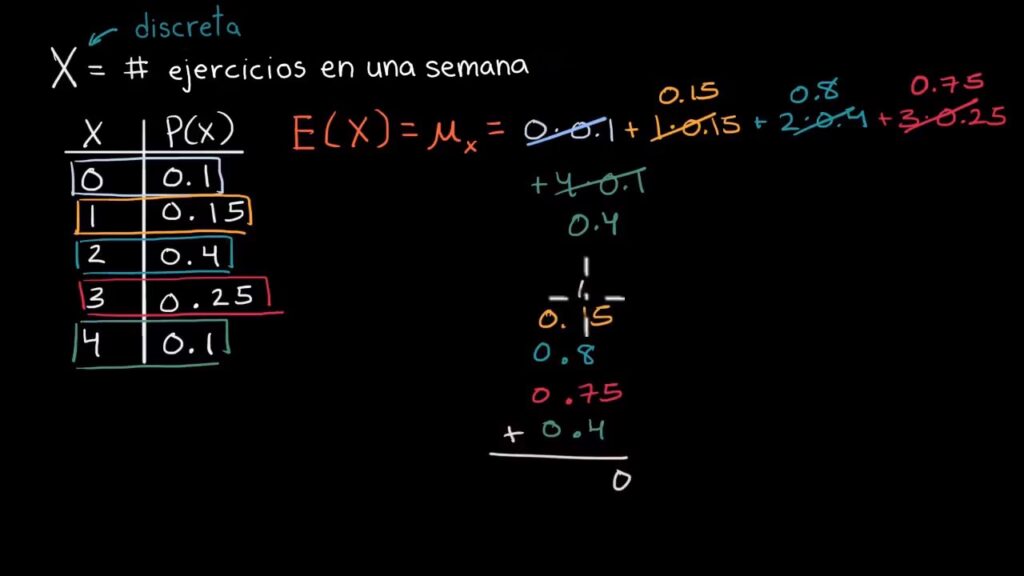 Para hallar el valor esperado o promedio a largo plazo, \u03bc, basta con multiplicar cada valor de la variable aleatoria por su probabilidad y sumar los productos.