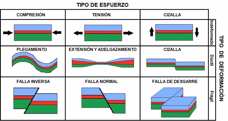 En geología, el esfuerzo cortante es la fuerza que causa el deslizamiento de rocas a lo largo de planos paralelos. Es un factor clave en la formación de estructuras geológicas como fallas (fracturas con desplazamiento) y pliegues (deformaciones por doblamiento de rocas), y es fundamental para entender la tectónica de placas y los terremotos.