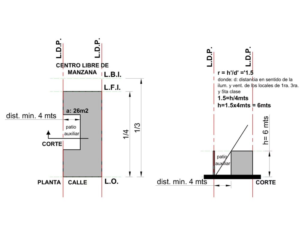 La normativa también contempla situaciones especiales. Por ejemplo, si una parcela se encuentra totalmente dentro de la franja perimetral edificable y la iluminación y ventilación de los locales se realiza hacia el espacio urbano, no es obligatorio construir patios interiores. Sin embargo, si la Línea de Frente Interno invade la parcela o resulta tangencial a uno de sus lados, se exige un patio asimilable a espacio urbano que se comunique directamente con el centro libre de manzana, reforzando la importancia de mantener la continuidad del pulmón verde.