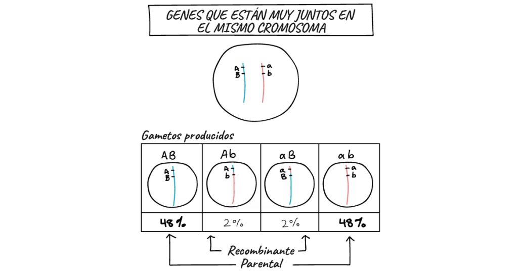 Si los genes B y E estuvieran en cromosomas diferentes (segregación independiente), esperaríamos cuatro tipos de gametos en proporciones iguales (25% cada uno): BE, Be, bE y be. Sin embargo, si están ligados en el mismo cromosoma, la situación cambia. Un organismo con cromosomas BE / be producirá predominantemente gametos parentales (BE y be). Si ocurre recombinación entre B y E, también se producirán gametos recombinantes (Be y bE).