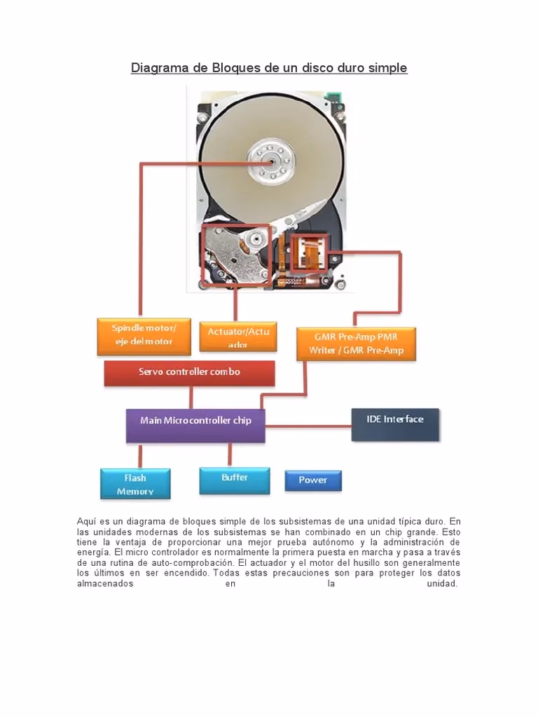 • Cabezales de Lectura/Escritura (Read/Write Heads): Son pequeños dispositivos que flotan a una distancia microscópica sobre la superficie de los platos. Hay un cabezal por cada superficie de cada plato. Son los encargados de leer y escribir la información magnéticamente.