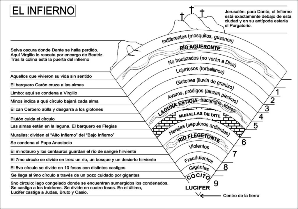 Contrario a la creencia popular de siete niveles, el Infierno de Dante Alighieri está estructurado en un vestíbulo y Nueve Círculos concéntricos. Cada círculo representa una gravedad creciente del pecado y un castigo específico, culminando en el centro de la Tierra con Lucifer, el máximo traidor.