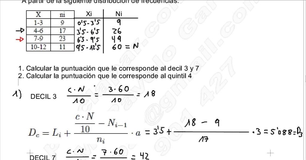 Q1 = 62 + (0.2 * (65 - 62)) = 62 + (0.2 * 3) = 62 + 0.6 = 62.6 - Q2 (Posición 6.4): Está entre el 6º (72) y 7º (75) dato.