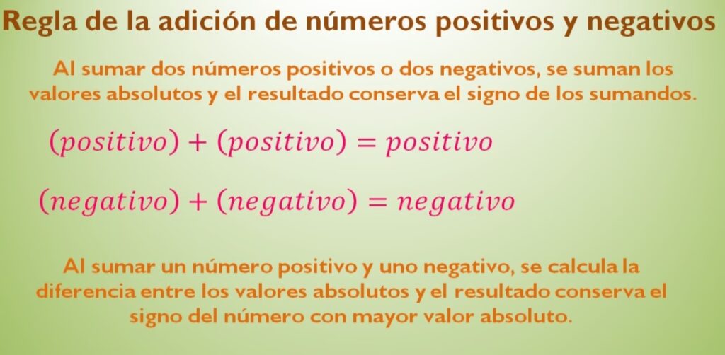 El signo del resultado lo determina el número que tenga el mayor valor absoluto. Si el número con mayor valor absoluto es positivo, el resultado será positivo. Si el número con mayor valor absoluto es negativo, el resultado será negativo.
