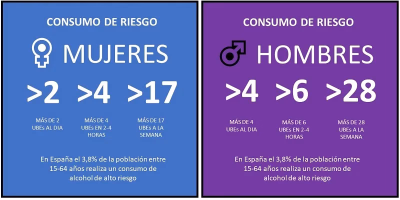 Para hombres, más de 28 UBE a la semana o más de 5 UBE por ocasión. Para mujeres y mayores de 65 años, más de 17 UBE a la semana o más de 3 UBE por ocasión.