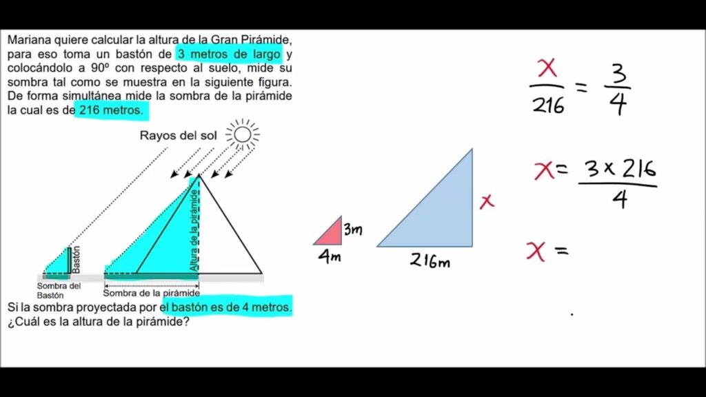 Dado que los triángulos son semejantes, la razón entre sus lados correspondientes es constante. Esto significa que la relación entre la altura de la pirámide y la altura del bastón es la misma que la relación entre la longitud de la sombra de la pirámide y la longitud de la sombra del bastón. Expresado matemáticamente: