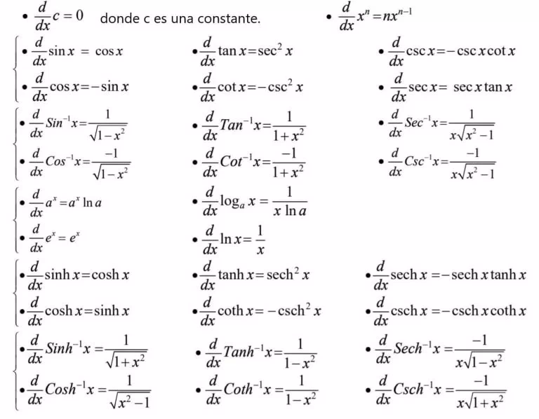 Para facilitar la aplicación de la Regla de la Cadena, es útil tener a mano las formas generalizadas de las derivadas más comunes, donde u representa una función de x (es decir, u = g(x)) y u' es su derivada (g'(x)).