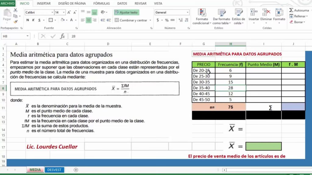 - Aproximación: El valor de la media es una aproximación, no el valor exacto. Esto se debe a que asumimos que todos los datos dentro de un intervalo se concentran en su marca de clase.